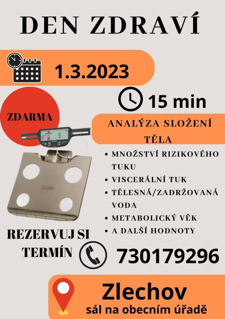 Lidé mohou přijít zdarma na analýzu tělesné skladby. To znamená: zjištění množství rizikového tuku, viscerální tuk, tělesná voda, metabolický věk a další hodnoty. Rezervujte si svůj termín na tel. 730179296.