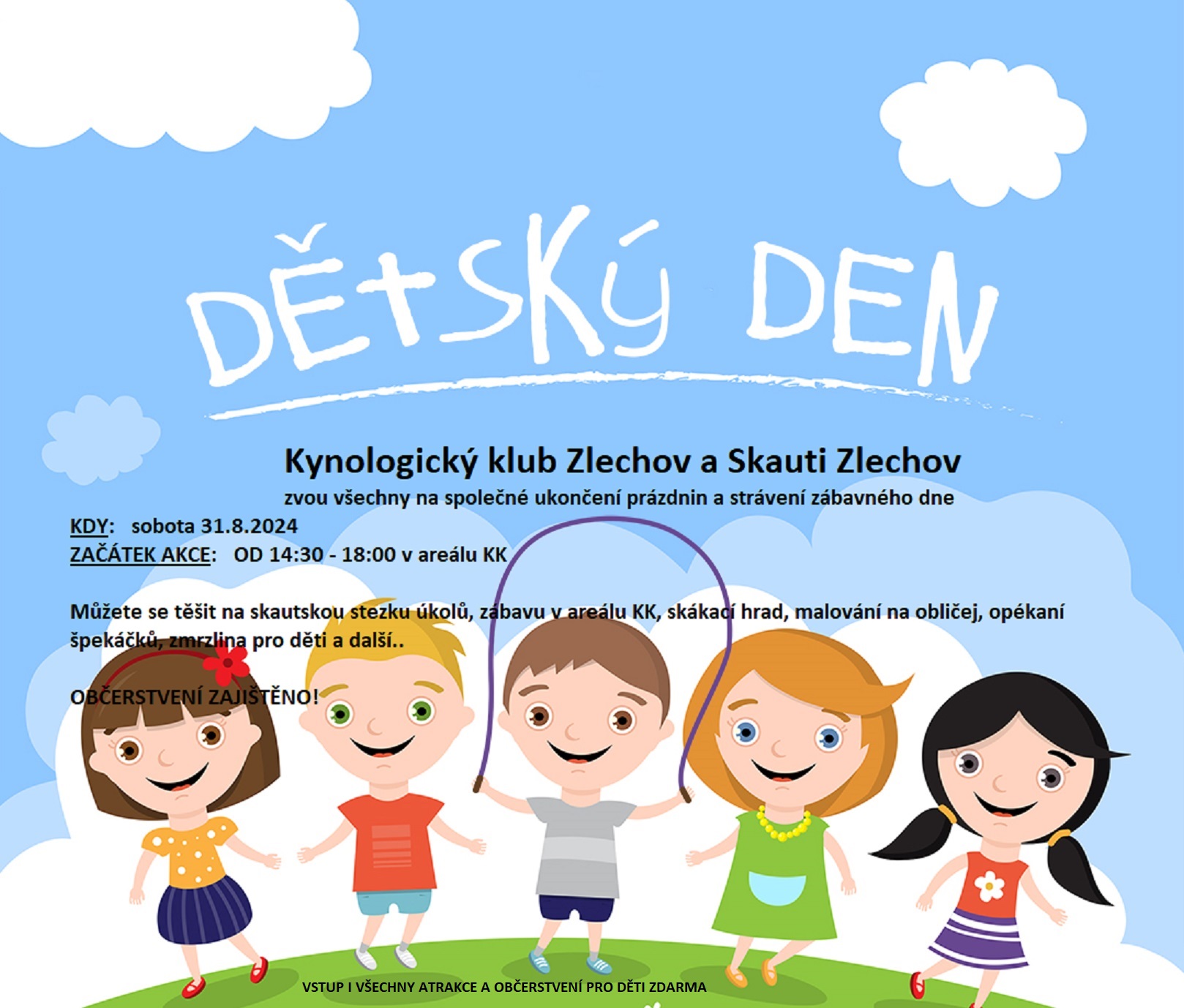 Kynologický klub a Skauti Zlechov zvou všechny na společné ukončení prázdnin a strávení zábavného dne v sobotu 31.8.2024 od 14:30 hodin do 18:00 hodin v areálu KK.
