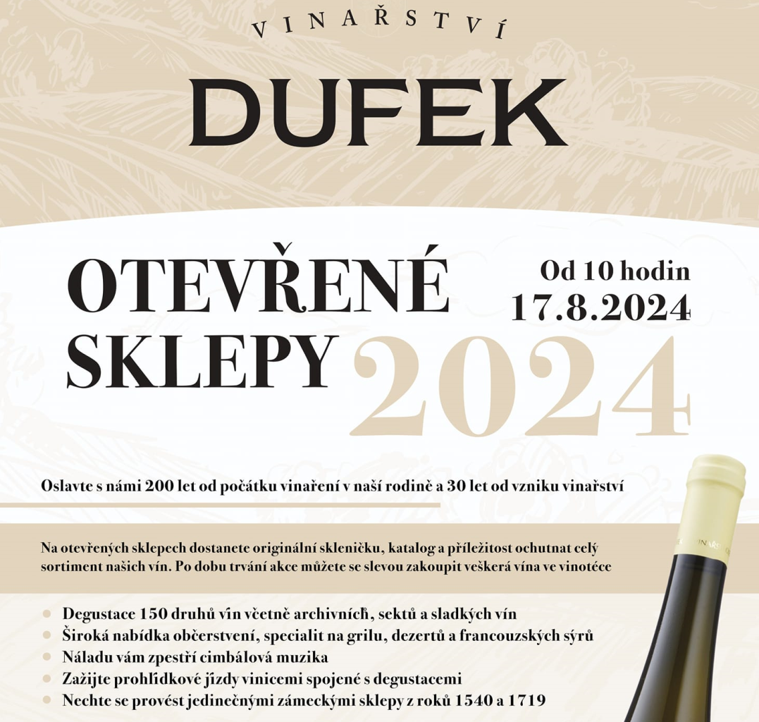 Zlechovští zahrádkáři Vás zvou na zájezd do Vinařství Josef Dufek ve Svatobořicích – Mistříně, které v sobotu 17. 8. 2024 pořádá Den otevřeného vinařství. Odjezd je v dopoledních hodinách od autobusové zastávky u kostela od Tupes. Cena zájezdu 750 Kč. V ceně je doprava, vstup do vinařství, katalog, neomezená ochutnávka vín, prohlídkové jízdy vinicemi a ochutnávka francouzských sýrů s doprovodem cimbálové muziky Hudci z Kyjova a vystoupením mužského sboru z Lovčic. Odjezd z vinařství v odpoledních až večerních hodinách. Hlásit se můžete telefonicky na číslech 608 278 193 nebo 736 601 926.