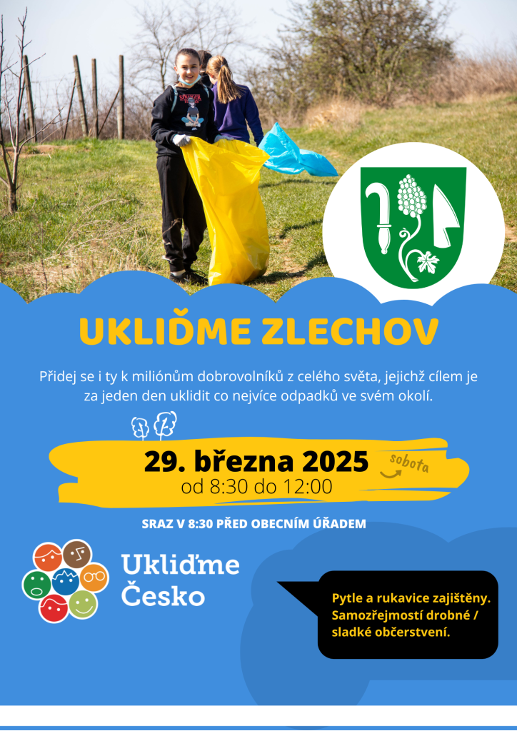 Dne 29. března 2025 proběhne v Zlechově akce „Ukliďme Zlechov“, která se připojuje k celosvětové iniciativě. V době od 8:30 do 12:00 budou účastníkům k dispozici pytle a rukavice, spolu s drobným občerstvením. Zapojte se a pomozte uklidit své okolí!