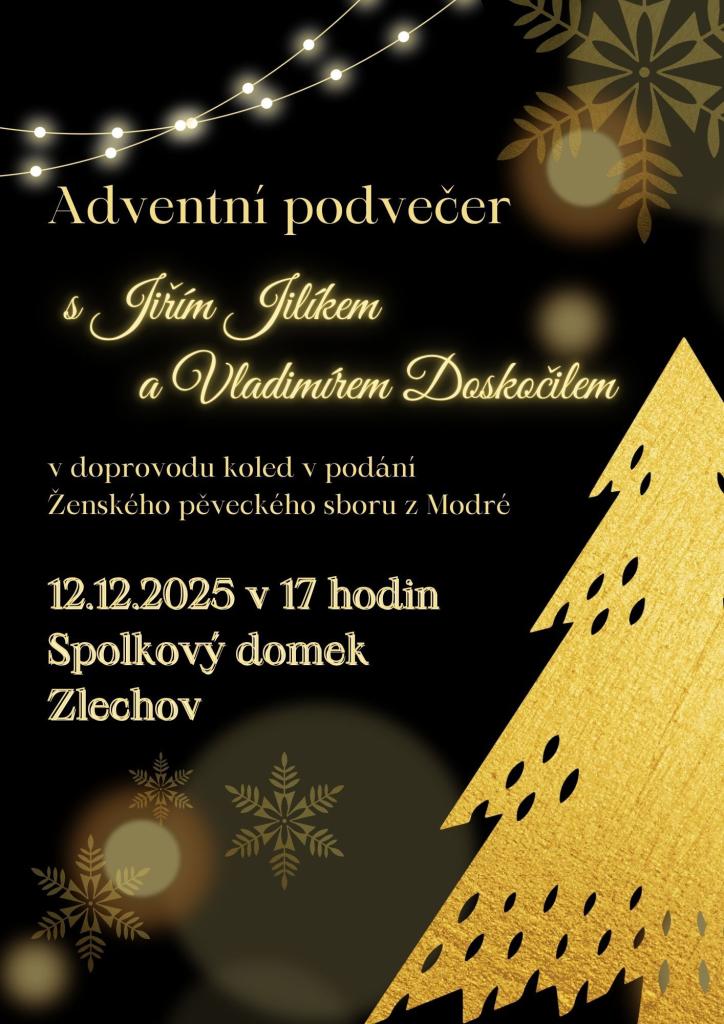 Zveme vás na adventní podvečer s Jiřím Jilíkem a Vladimírem Doskočilem , který se uskuteční 12. prosince 2025 v 17 hodin ve Spolkovém domku v Zlechově. Program obohatí koledy v podání Ženského pěveckého sboru z Modré. Přijďte si užít sváteční atmosféru a společně se naladit na vánoční období.