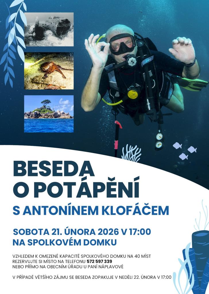 Zveme vás na besedu o potápění, která se uskuteční v sobotu 21. února 2026 v 17:00 na Spolkovém domku. Beseda povede Antonín Klofáč a bude se zaměřovat na zajímavosti a techniky potápění. Vzhledem k omezené kapacitě Spolkového domku na 40 míst je nutné si místo rezervovat. Rezervace je možná telefonicky na čísle 572 597 339 nebo přímo na obecním úřadu u paní Náplavové. V případě většího zájmu se beseda zopakuje v neděli 22. února v 17:00.